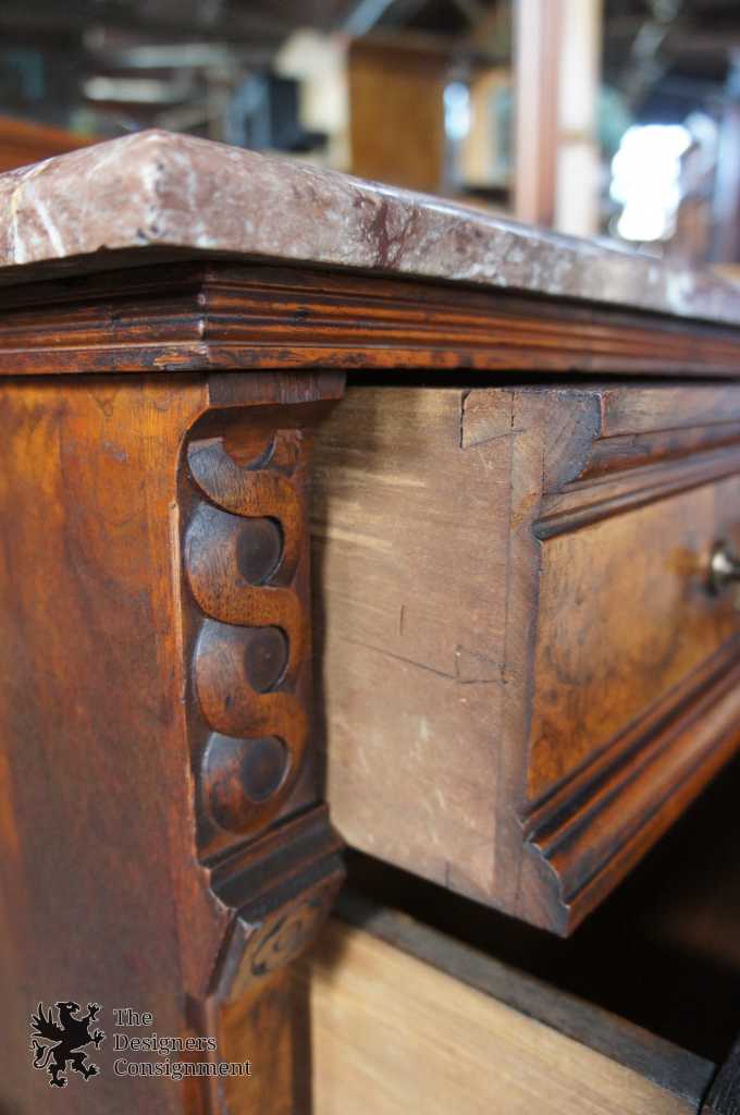 This gorgeous Victorian era dresser comes from the aesthetic period, circa 1880s. The aesthetic movement was a late nineteenth century movement that championed pure beauty and 'art for art's sake' emphasizing the visual and sensual qualities of art and design over practical, moral or narrative considerations. Made from walnut with carved trim, burled front panels and a pink marble top. Includes 5 drawers with classic period hardware. Matching washstand available.