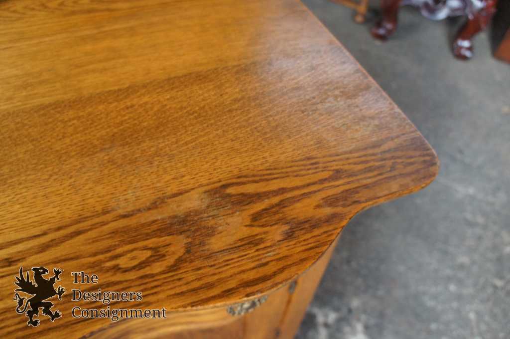 A beautiful golden oak washstand. Circa early 1900s. Features a serpentine front with one full drawer above 2 half drawers and lower cabinet portion. Original harp shaped towel bar is still in place. Drawers are mounted with brass hardware. Lower apron shows a scallop carved accents. A neat addition to any setting.