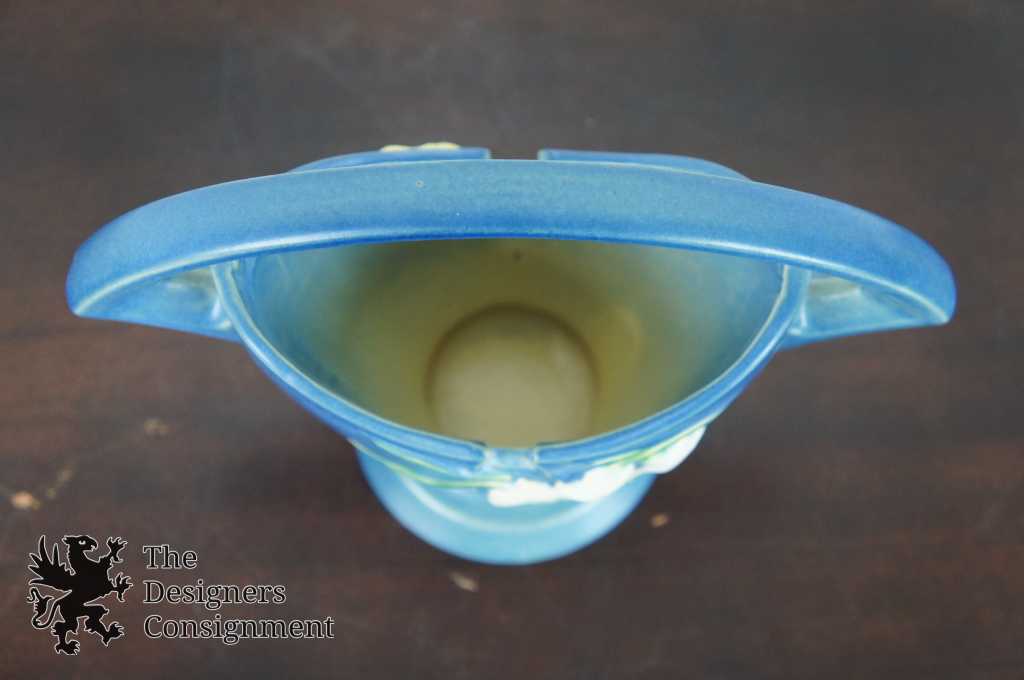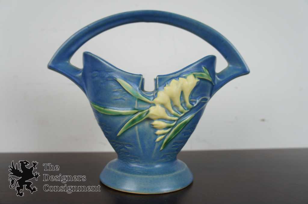 The exceptionally designed Roseville Pottery Freesia Blue basket. Circa 1940s.