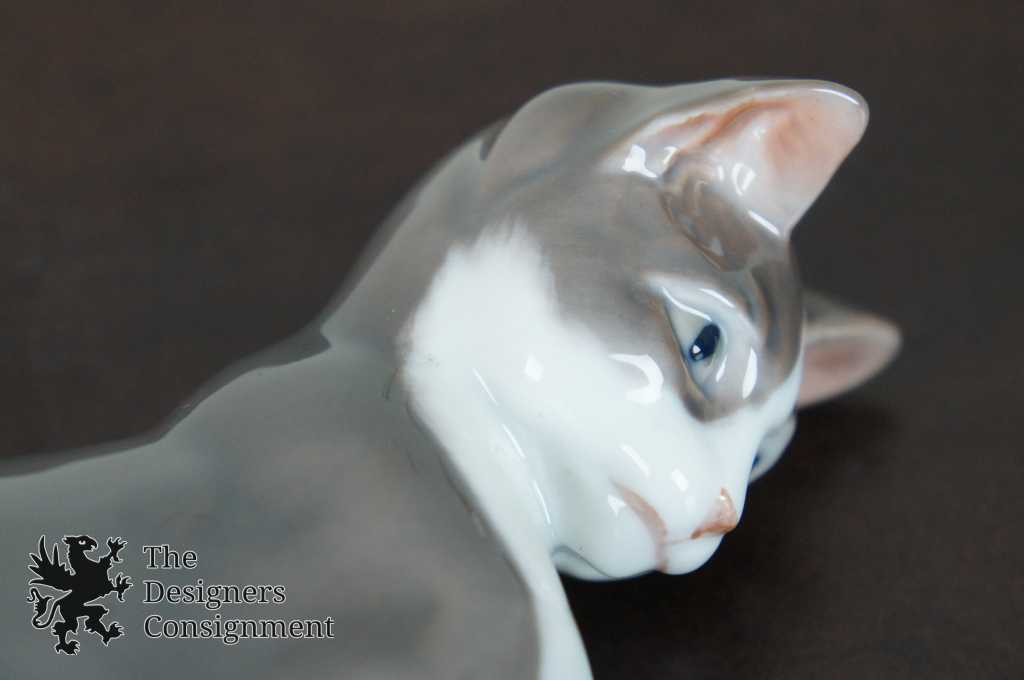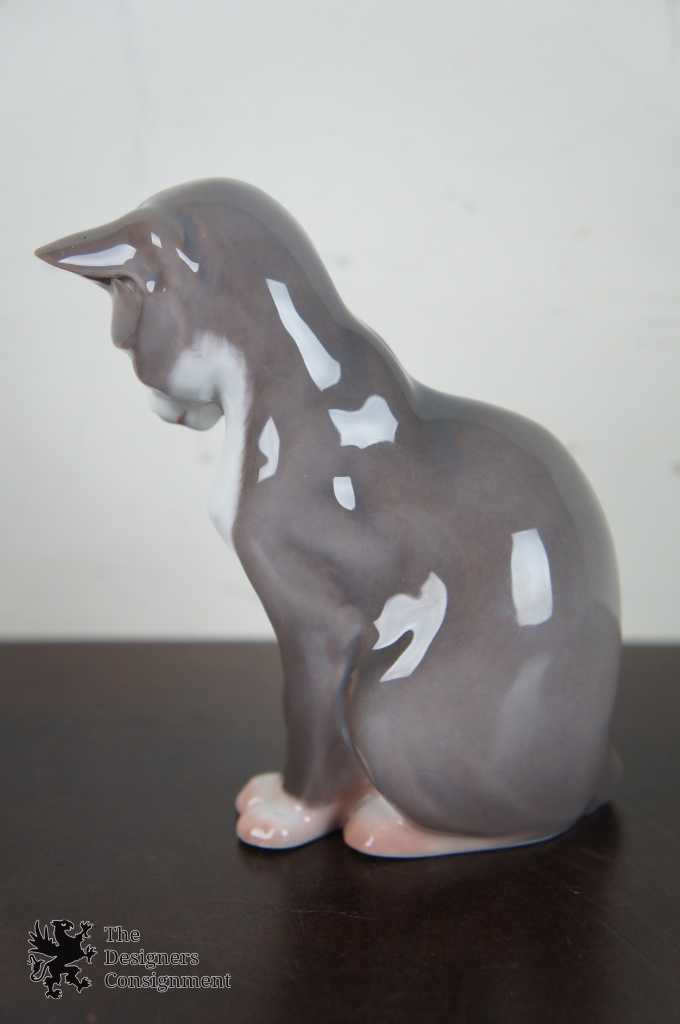 Bing Grondahl (B&G) Porcelain Cat Figurine. Grey & White, Seated. Made in Copenhagen, Denmark.