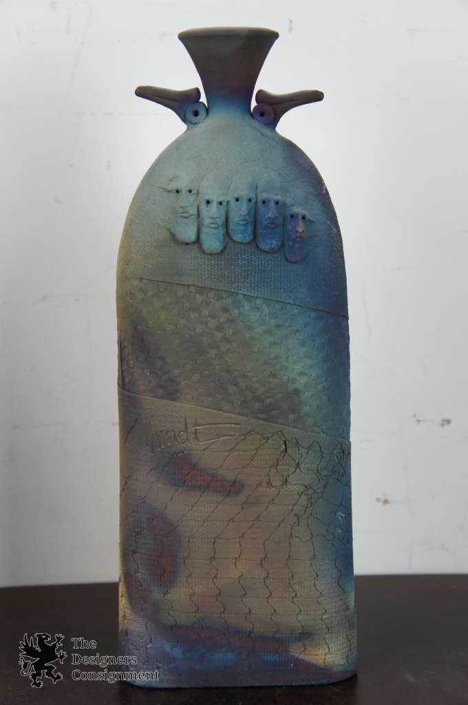 A beautiful pair of figural raku vases by the american renowned artist Phil Mundt. Each vase is hand signed by the artist. Iridescent bottle shape with 5 faces along the top. Phils Bibliography is below