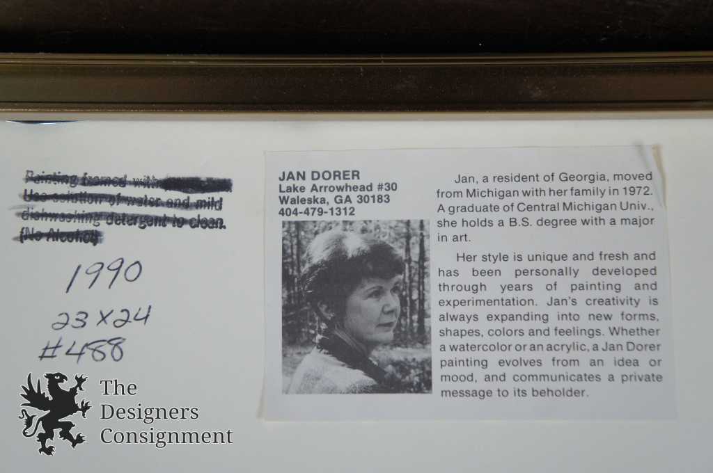Her style is unique and fresh and has been personally developed through years of painting and experimentation. Jan's creativity is always expanding into new forms, shapes, colors and feelings. Whether a watercolor or an acrylic, a Jan Dorer painting evolves from an idea or mood, and communicates a private message to its beholder.