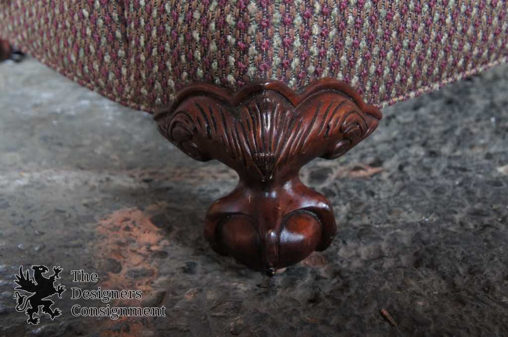 Stanley Upholstery over sized wing-back chair and ottoman. Features a purple tweed upholstery with ball and claw feet. Includes removable slip covers.