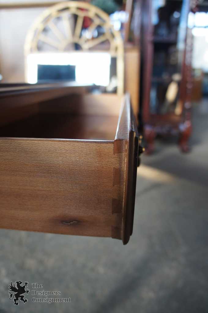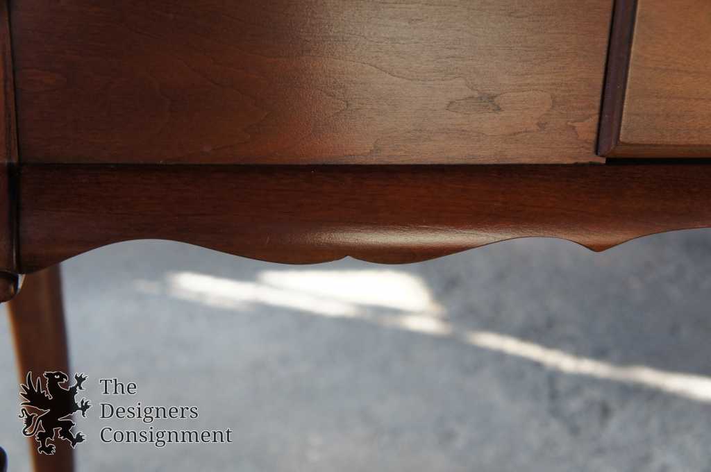 A beautiful Queen Anne style cherry console table. long and slender with a serpentine apron centered between cabriole legs. At the center there is a dovetailed drawer with brass hardware. A perfect addition to any setting.