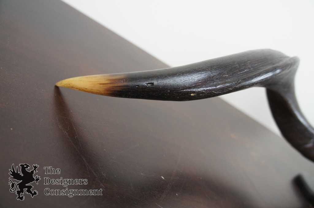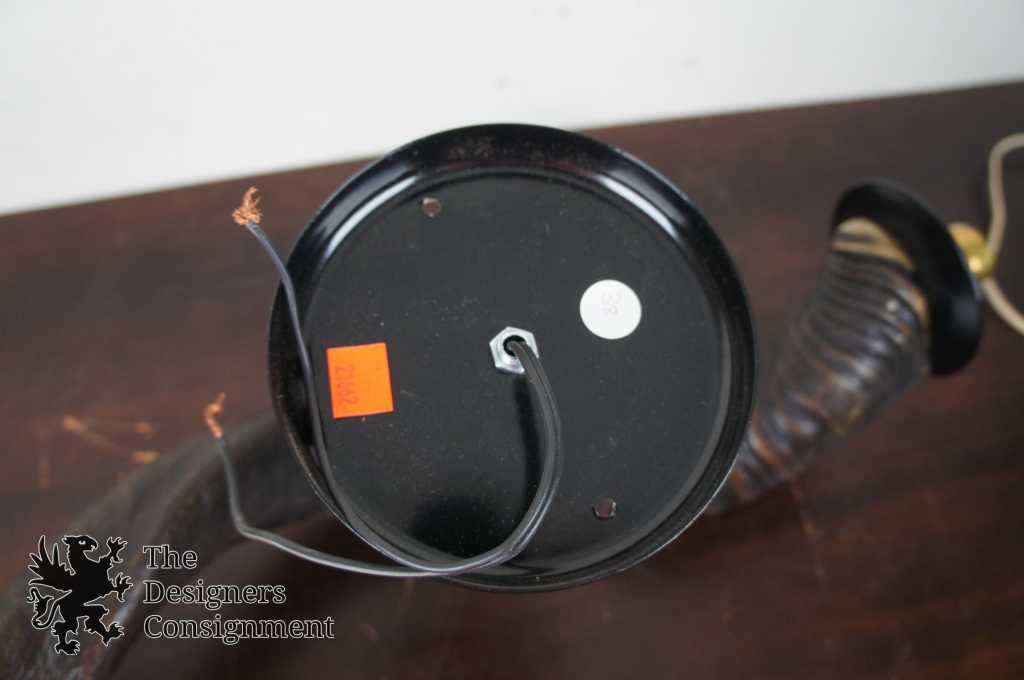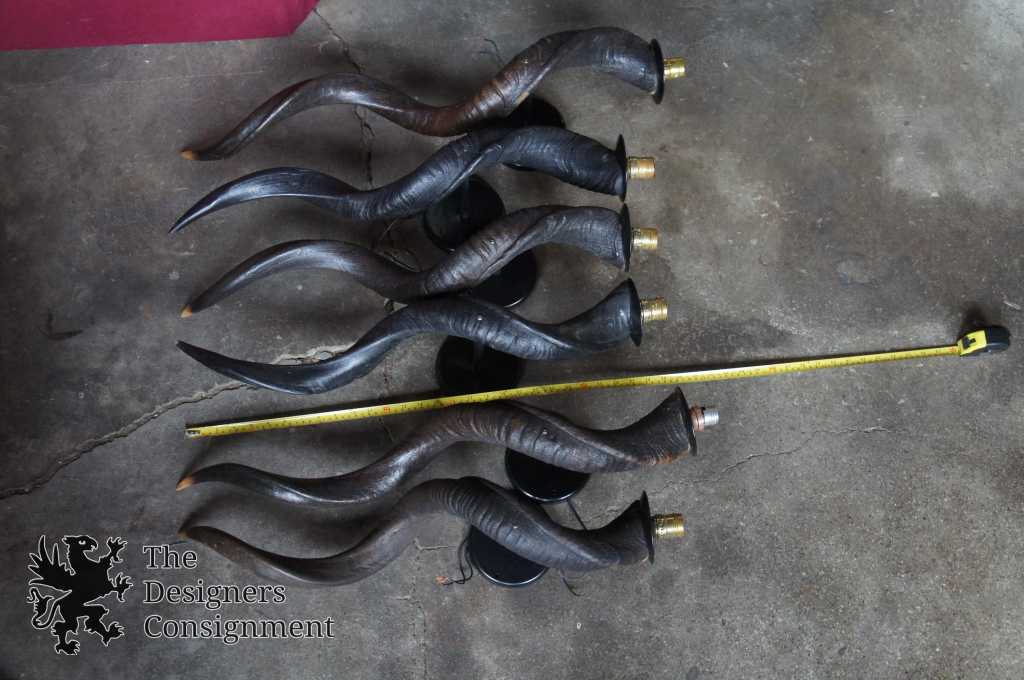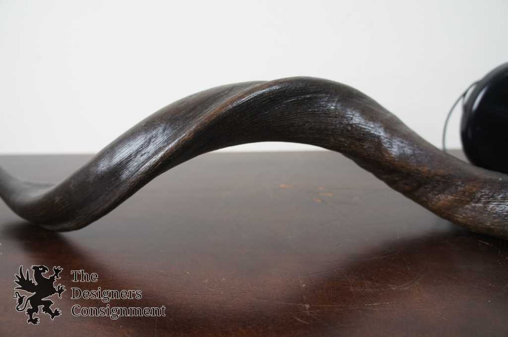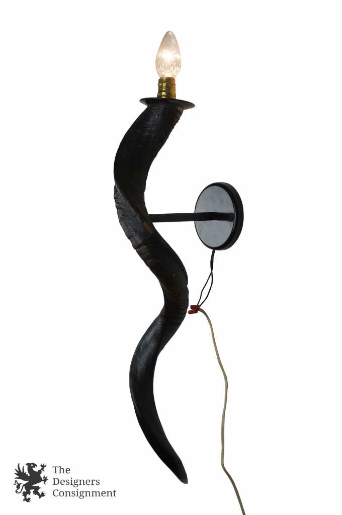 African Kudu wall sconce. The dark brown to black kudu horn gently spirals down any wall with blending with any color pallet. Each horn is mounted to a black wall plate. There are 6 available, and they are being sold individually.