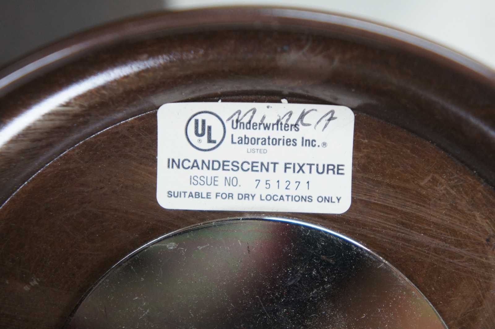 Two monumental French Empire style wall sconce torch lights with frosted glass shade. Made by Minka Lavery. Torch shaped with spiraling design. Made from metal with a brass finish and molded composition center. The lantern is set at any angle, and nicely weighted. The perfect compliment to any setting.