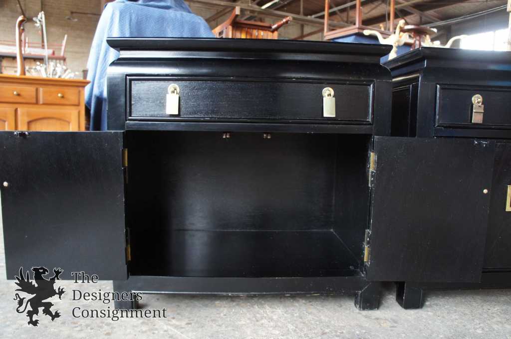 A lovely pair of Century Furniture Chin Hua nightstands. Made from maple with a black lacquer finish and brass hardware.