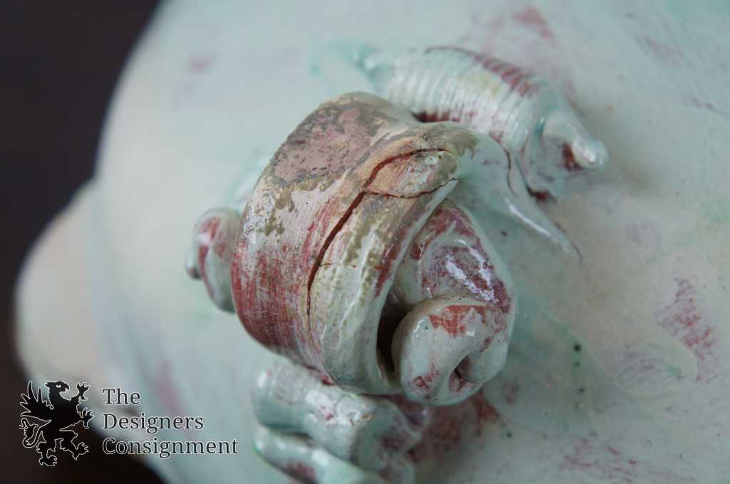 A gorgeous dragon tureen by the Florida ceramicist Vincent Sansone. Meticulously detailed with grooved teeth, vivid eyes and pierced nostrils. The tureen is hand painted with blues and greens. Includes a lid and ladle. Signed along the base.