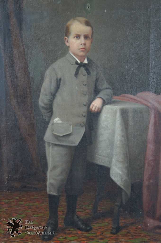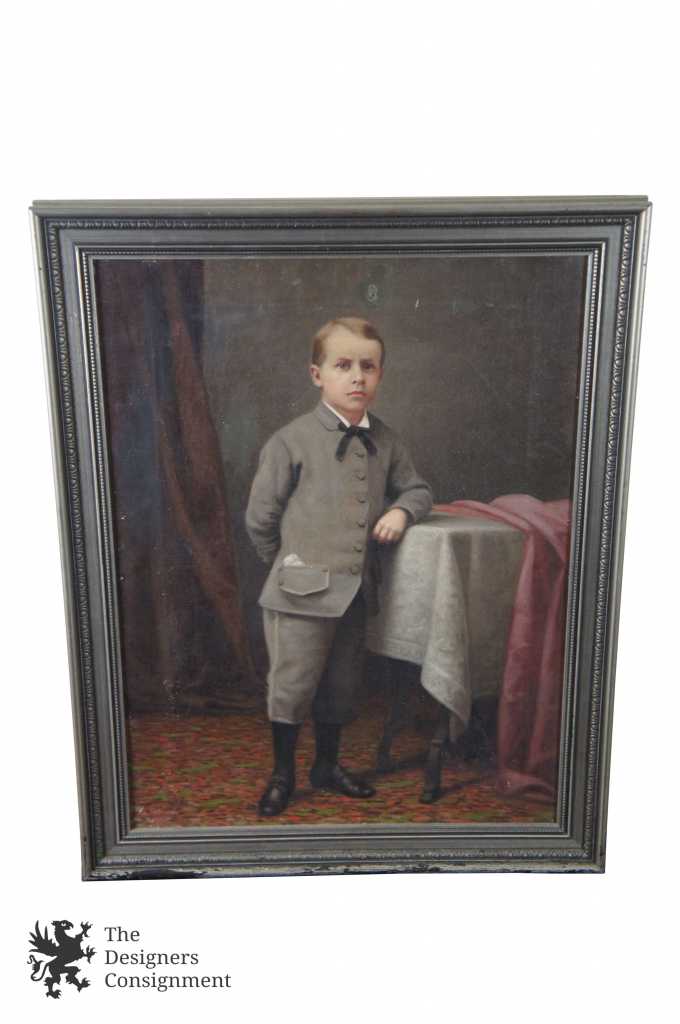 Features a young Victorian boy dressed in formal attire, leaning on a table. Frame and oil show signs of wear and age.