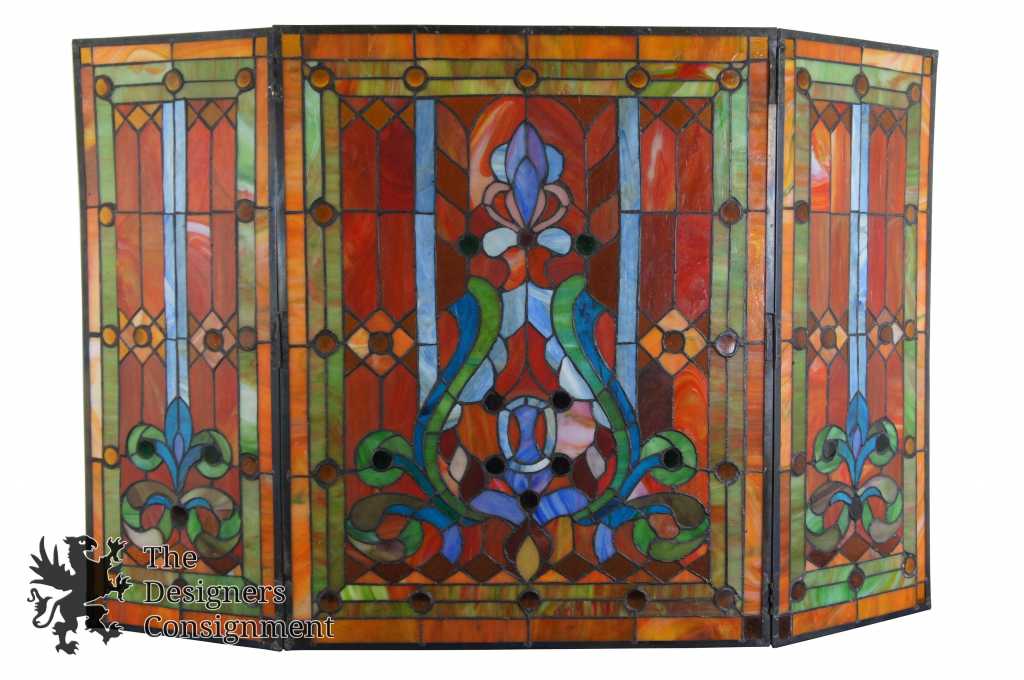A lovely 3 panel stained glass screen with fleur de lis pattern.