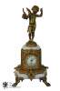 The clock features a gilt cylindrical design with putti centered on top of a piece of bakelite. The base is marble with paw feet.