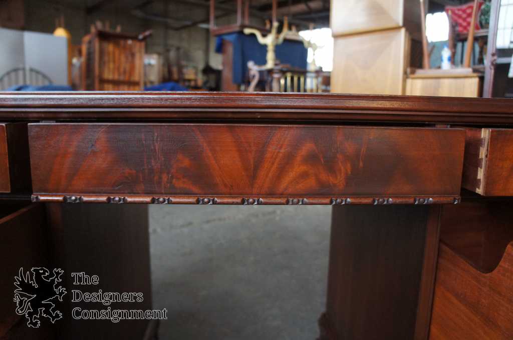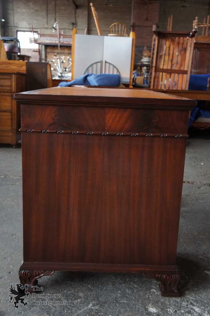 Up for consideration is a beautiful circa 1940s Chippendale style knee-hole desk by Imperial Furniture out of Grand Rapids Michigan. Made from mahogany with 8 drawers showing crotch front with brass hardware. The leather or vinyl top is inset allowing for a perfect writing surface. Feet are bracketed with acanthus carved trim. A neat addition to any office or study.