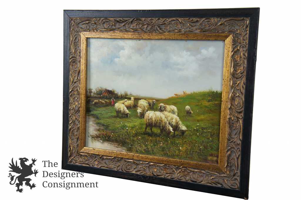 A Dutch inspired oil painting on board. Sheep can be seen grazing the pastures on an overcast day. A woman watches from a far several hundred yards from her cottage. Beautifully executed with vibrant color. Professionally framed in black and gold.