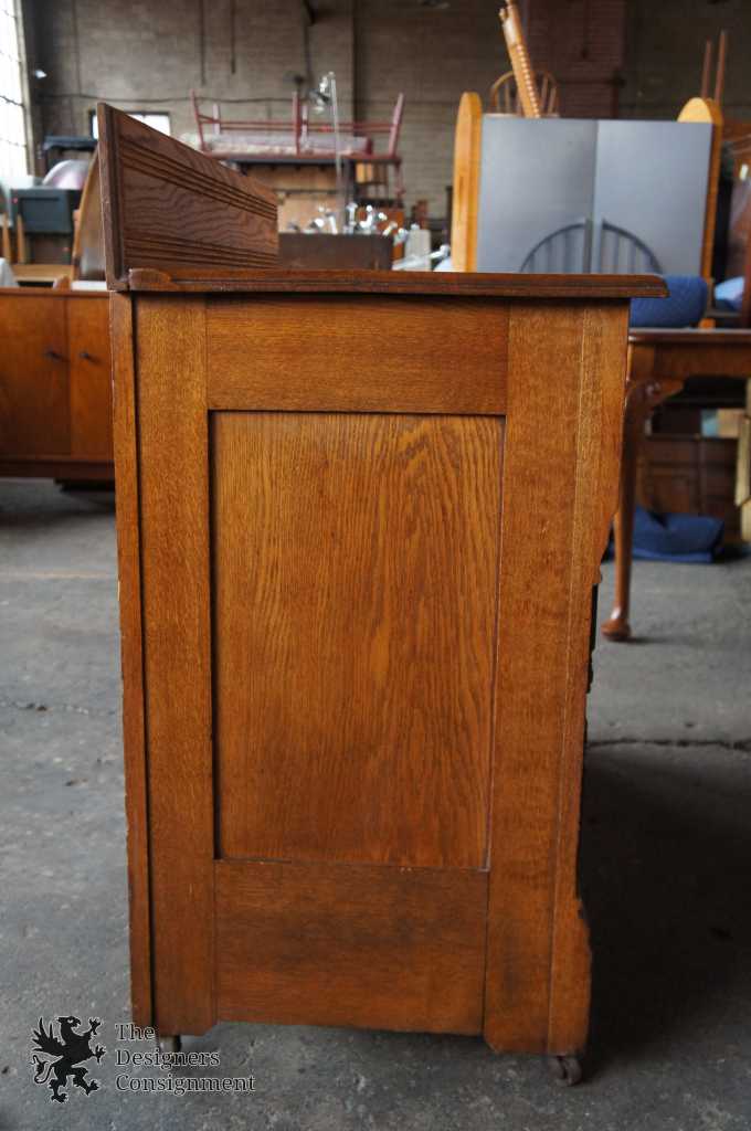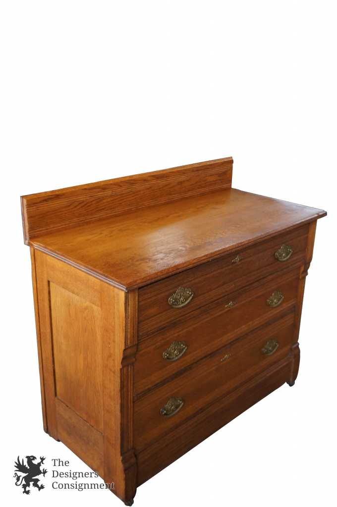 Circa 1880s American Golden Oak Dresser. Features 3 drawers with intricate brass hardware. Each drawer shows Knapp Joint construction. The Knapp joint was was pioneered during the late Victorian Era in post Civil War United States by Charles Knapp. A significant advancement in the furniture industry as it allowed drawers to be made by machine instead of hand. It quickly propelled furniture production from about 20 drawers a day to 250! The Knapp joint was in production from 1870-1900 making it a somewhat rare find. It is also known as Pin & Cove. Pin & Scallop and Half Moon joinery.