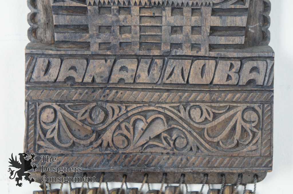 Beautifully engraved bovine calendar. Hangs from carved wooden plaque with hut. Marked Danau Toba from Lake Toba, Indonesia.