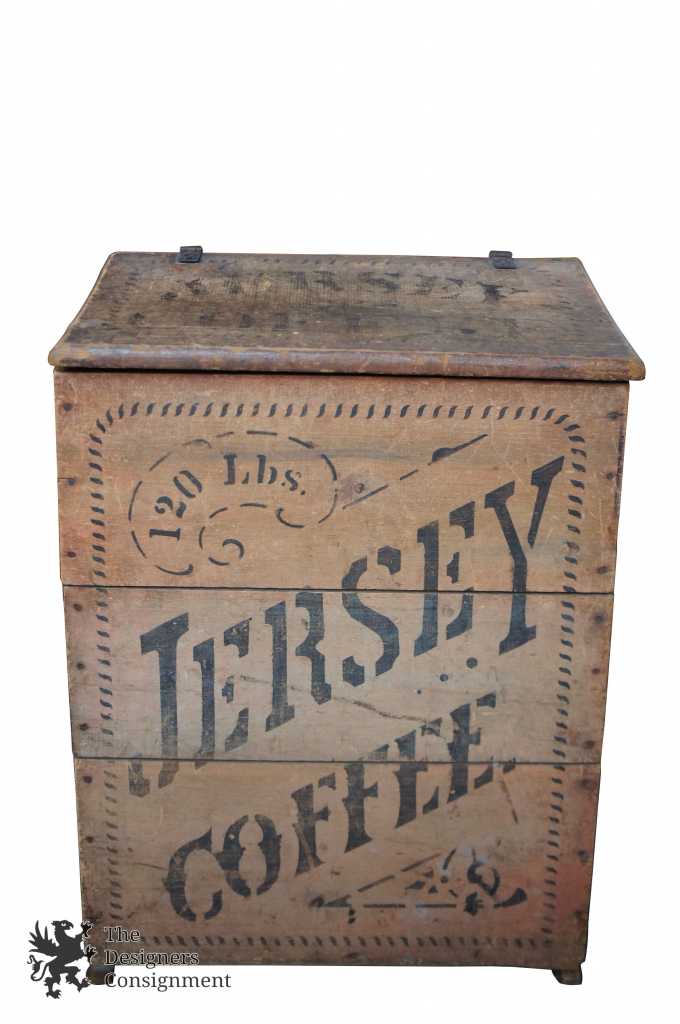 Jersey Coffee General Store 120lb storage bin. Circa 1890. A well kept primitive with the original Dayton Spice Mills label along the inside.