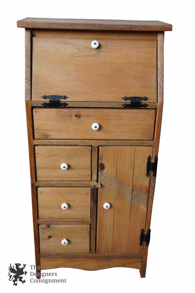 Mid 20th Century Country Pine Secretary. Features a drop front and 4 drawers with porcelain knobs and iron hinges. Side cabinet opens for storage of larger items. A neat addition to any setting.