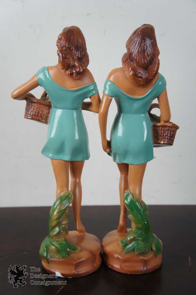 Up for consideration are 2 Universal Statuary Corp figures. Features women in a low cut dress holding flower baskets. Each figure is revealing a nipple. Made from chalkware with elaborate detail.