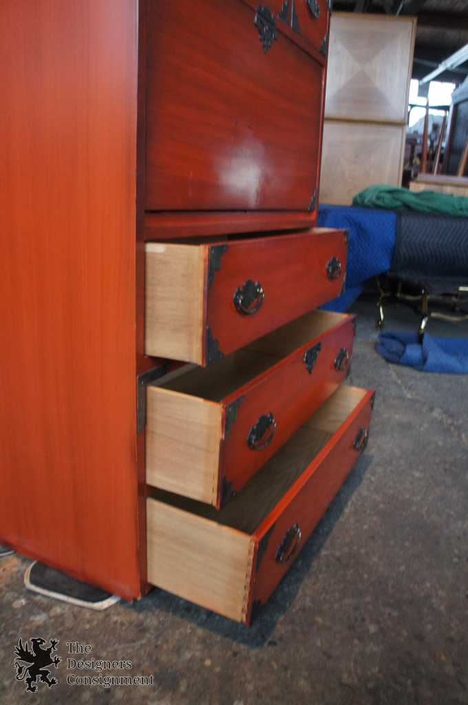 A gorgeous secretary desk from Thomasville's Passport collection. #2556-320. The passport collection was inspired from historic furniture from around the world. The beautiful chest features a Japanese Tansu inspired design with drop front writing surface. The cabinet is finished in a bold red-orange color with brass hardware. Includes 4 drawers, interior light and shelf. The black writing surface is both durable and stain resistant.