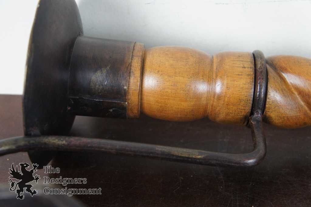 Up for consideration are two Spanish Revival wall sconces. Made from wood with a tapered barley twist design topped with an iron plateau for candles to rest upon. The sconce is connected to the rustic wall plate by a scrolled iron accent. A beautiful design that will bring warmth to any setting.
