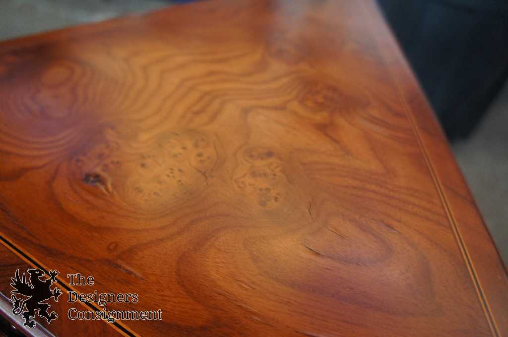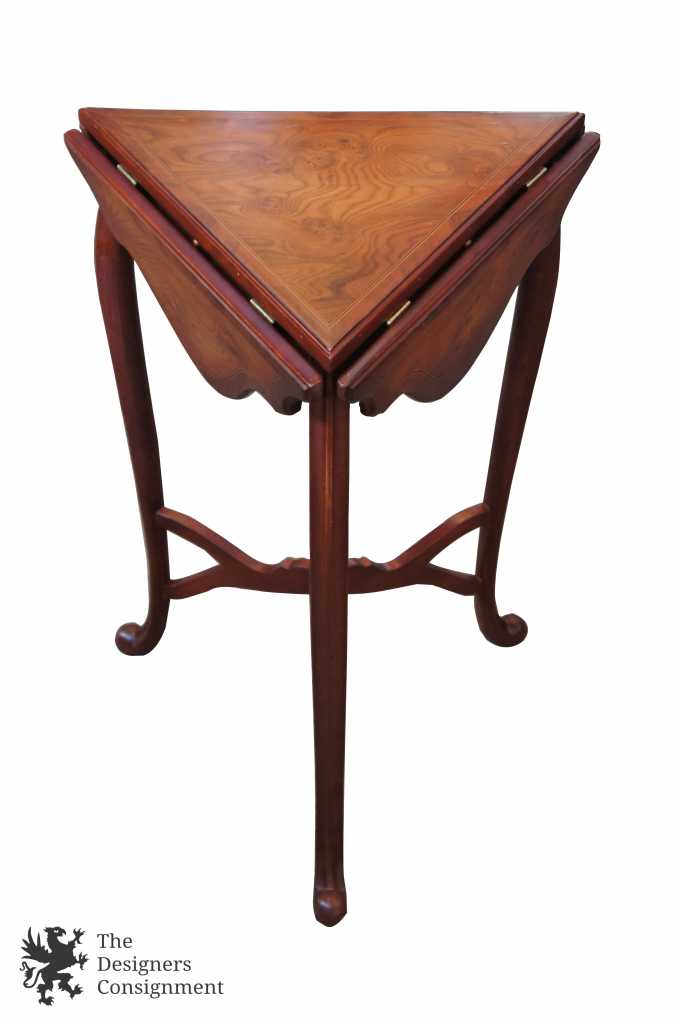 Features a beautiful burl wood triangular top with inlaid scalloped edges and drop leaves.