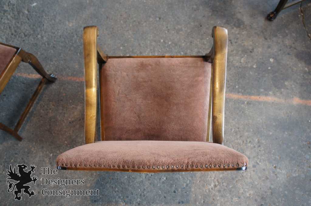 A gorgeous set of 3 early 20th century chairs. Made from walnut with scrolled accents and lion carved paw feet. Upholstered in a light maroon/burgundy with nail head trim along the seat back. A perfect set of chairs to accommodate a desk or library setting. Along the top of the back of each chair there is a finger groove for when you need to pull them out.