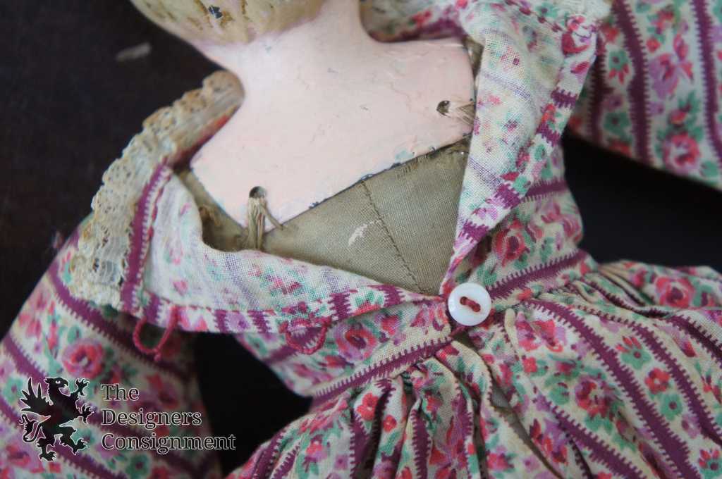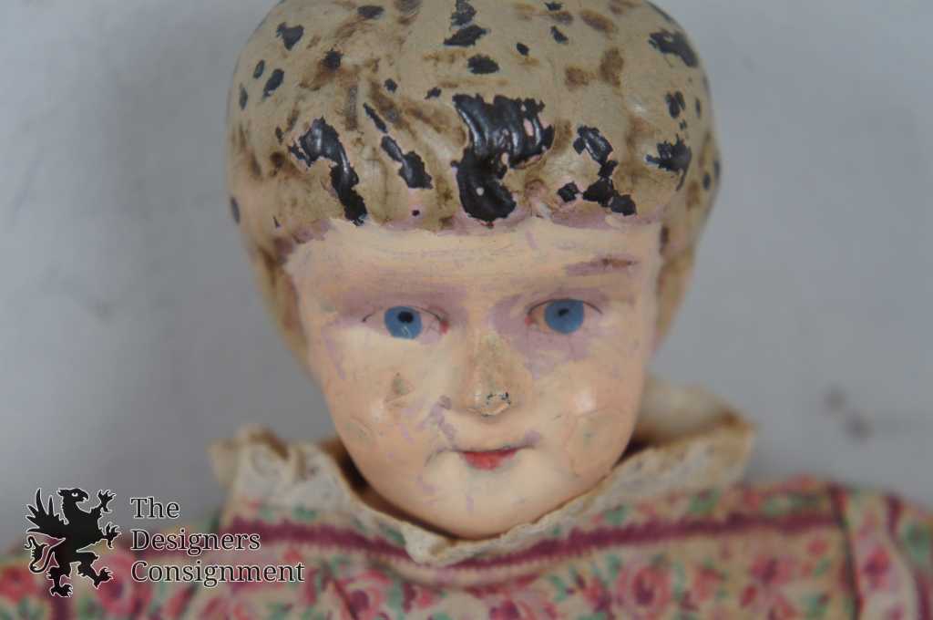 Antique Tin Head Doll w/ Cloth Body Floral Calico Dress Pink & White Minerva