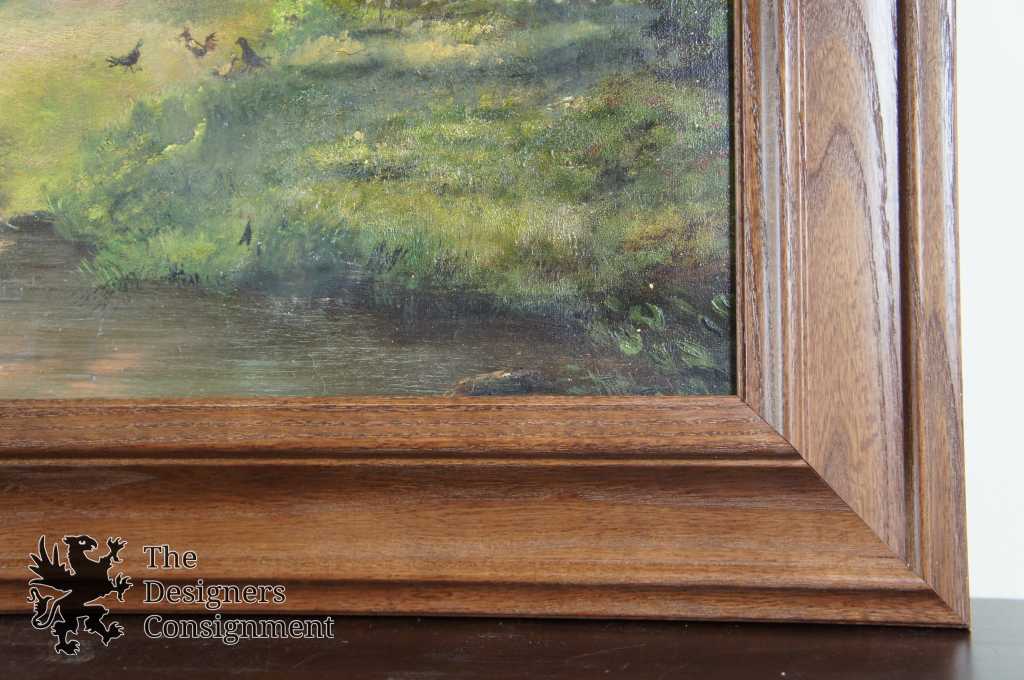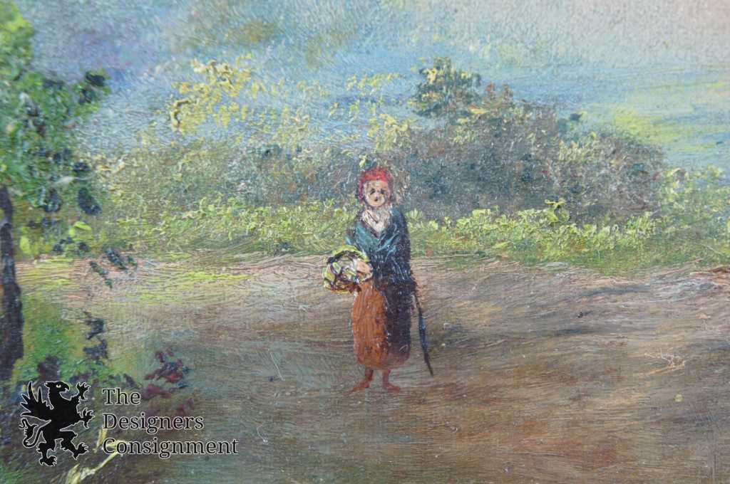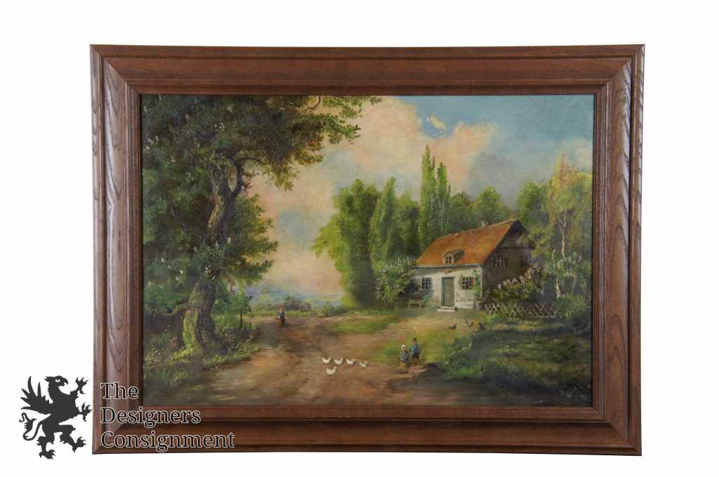 Unsigned countryside oil painting. Depicts a lady, two children and some ducklings alongside the trail outside their cottage. Professionally framed.