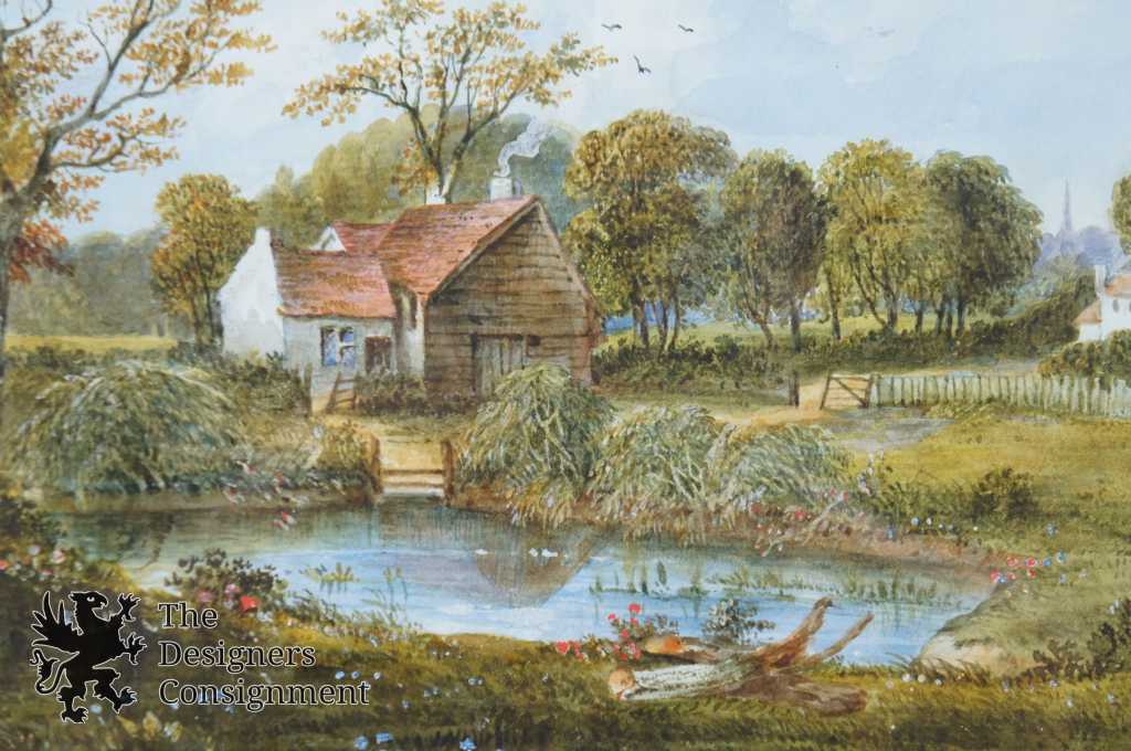 A lovely 20th century country side watercolor painting. depicts a cottage and near by pond. Framed with glass covering.