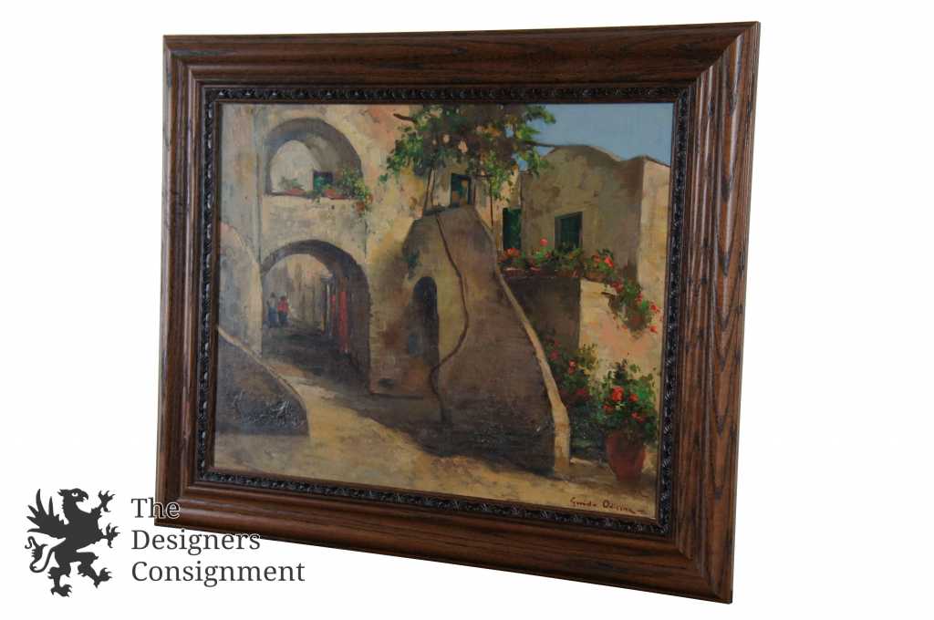 20th century southwestern oil on board. Signed lower right. Depicts a pueblo with flowers and figures. The signature which is somewhat distorted appears to have the last name of Odicena. This piece is professionally framed with an oak finish.