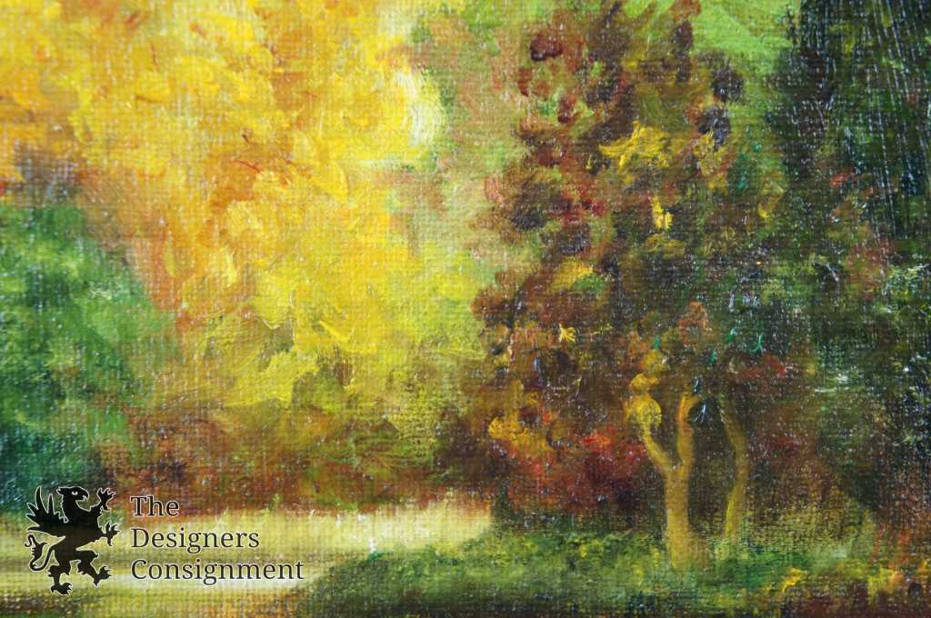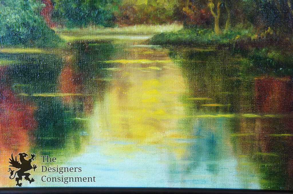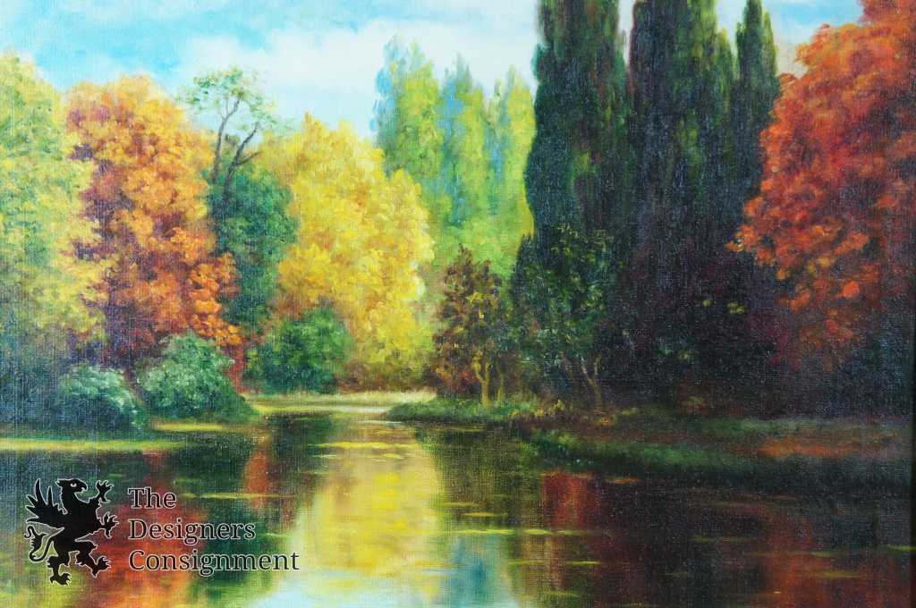 A beautiful autumn lakeside painting showing the leaves turning as they elegantly reflect on the water. Signed lower left with professional frame.