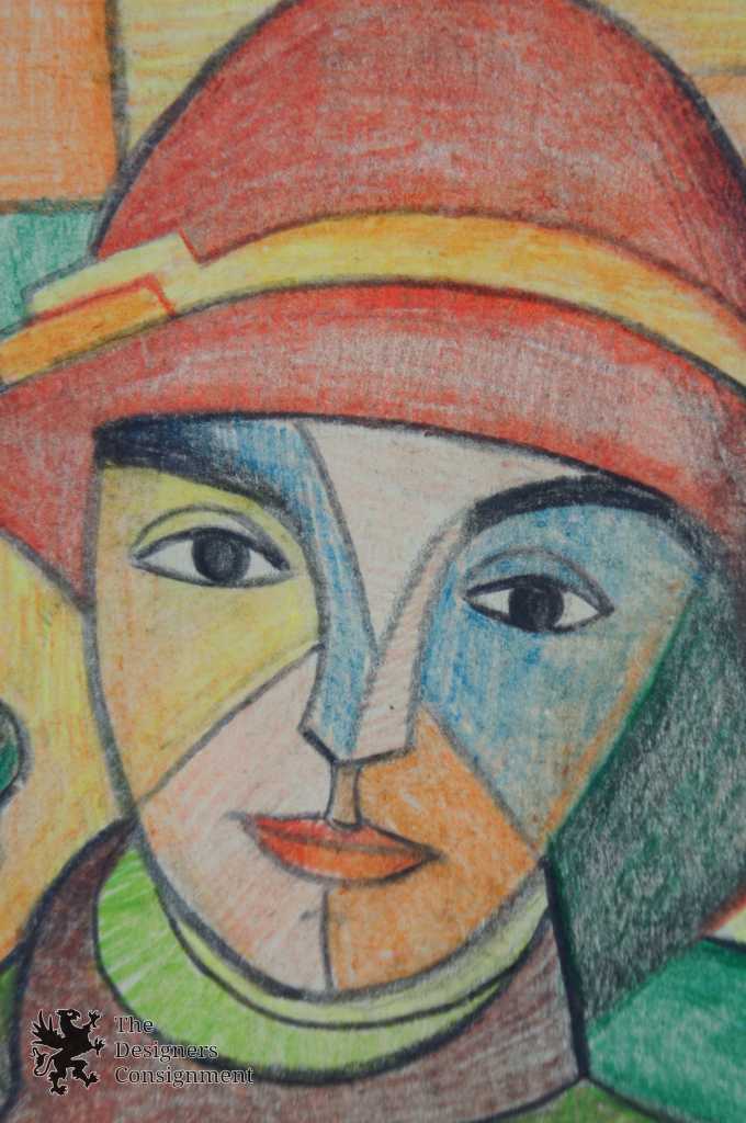 Exceptional Russian avant-garde pastel, circa mid 20th century. Signed KZ along the right side. Beautifully detailed with vibrant colors in classical cubist fashion. Features a seated woman in cloche hat with coffee mug holding a folding fan. Framed in a black pine with gloss covering.