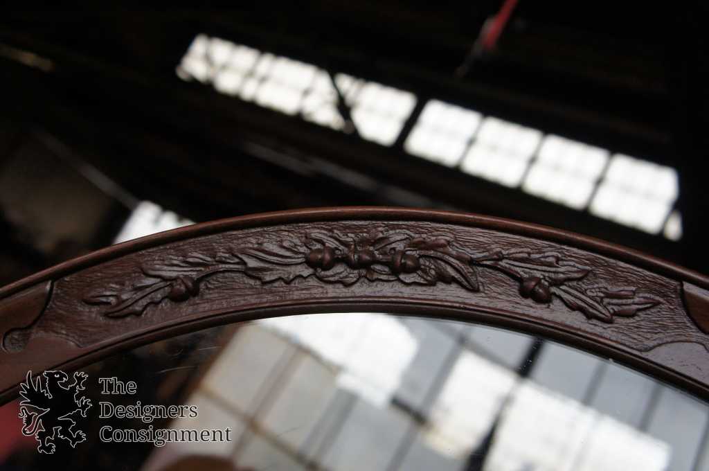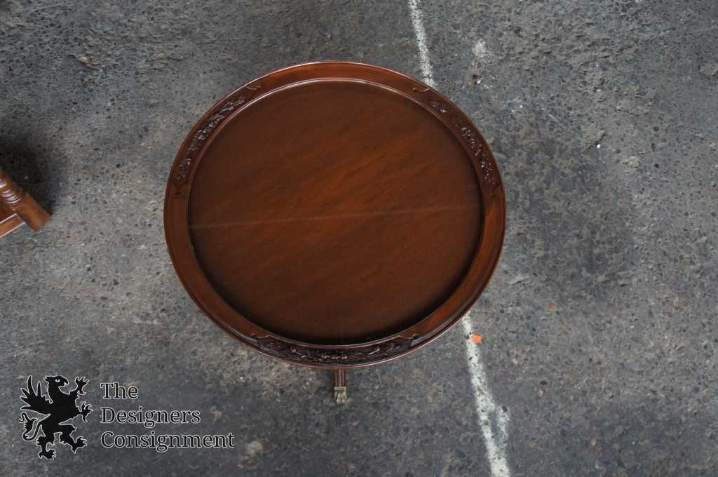 This table features a removable glass top for serving. The glass top has three carved sections showing a acorns and leafs. The table top is a smooth mahogany and is supported by 3 long sabre legs with brass claw foot caps. The mark along the bottom of the table is very worn and hard to see.