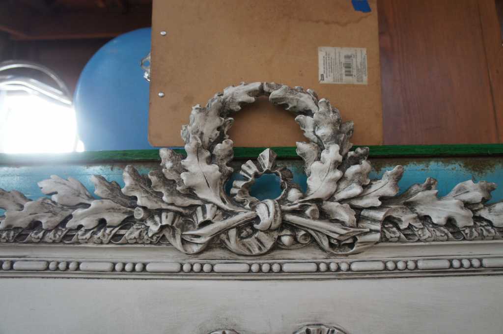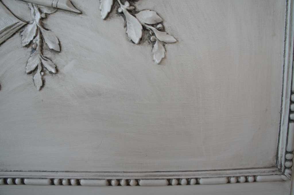 Painted Louis XVI style trumeau mirror with high and low relief carvings. Upper molding shows a laurel wreath of acanthus leaves leading down to the main panel of instruments and music sheets. Framed in classic French ribbon carving. Finished in antique white with rubbed finish. Perfect for hanging above a mantel piece.