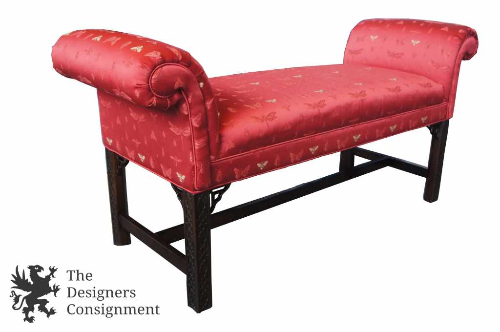 Up for consideration is a beautiful bench seat by Thomasville. Chinese Chippendale style with carved fretwork and an elegant red upholstery. Complete with rolled arms and an H stretcher trestle base. The lovely red upholstery shows an insect pattern covered in butterflies, bees and dragonflies. The piece is signed along the bottom, and was manufactured in 2005.