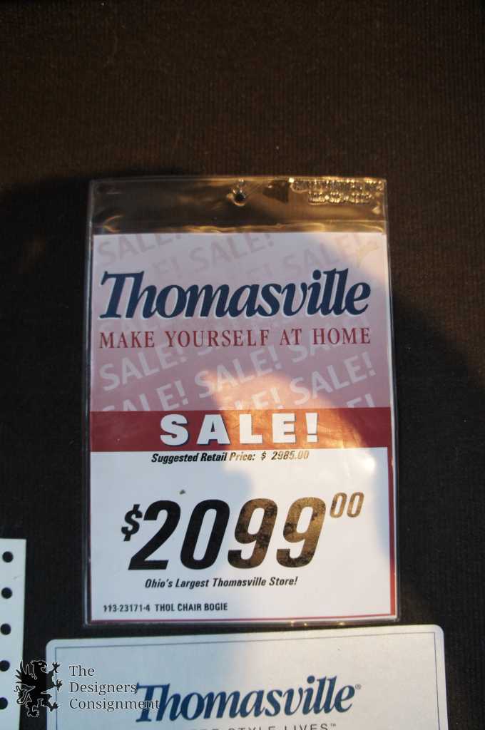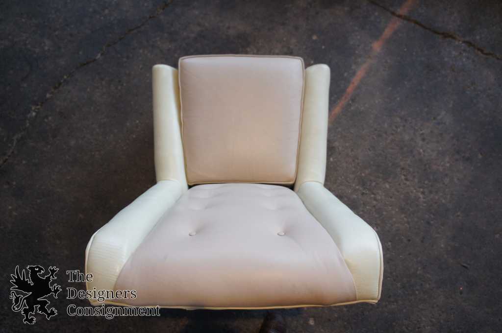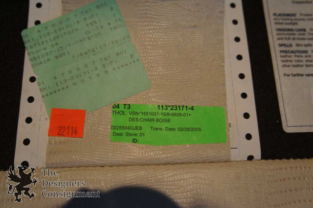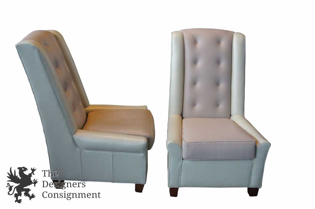A lovely pair of chairs from Thomasville's Bogart Collection. The bogey chair features a high tufted leather back allowing it to standout in any room. A two tone leather with white along the outside and beige pink for the seat and pack. The white leather grain appears to be alligator leather making for an even more rare find. Thomasville recently filed for bankruptcy, so these chairs will be harder and harder to find. This set was purchased in 2003. Retail $2,099 Each.