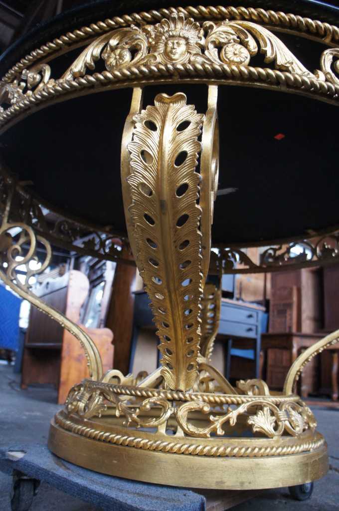 A gorgeous French inspired centre table by Henredon. Made from cast iron with a gold finish and faux marble top. A meticulously detailed table with figural mounts portraying the solar deity, or god of the sun. A beautiful addition to any space.