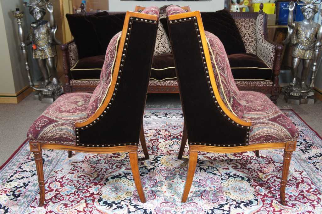 Louis XV inspired with exceptional carvings and floral medallions. Features a purple paisley upholstery along the front and dark burgundy velvet covering the back. Upholstery highlighted with brass nail-head trim. The perfect compliment to any setting.