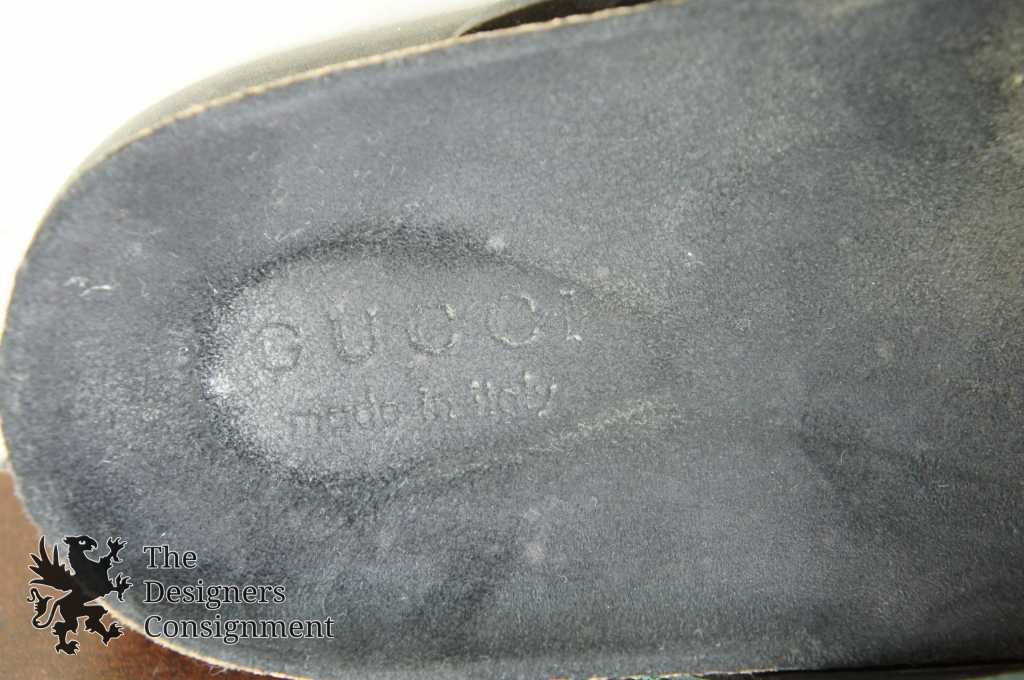 Features classic Gucci red/green stripe criss crossed with a leather strap