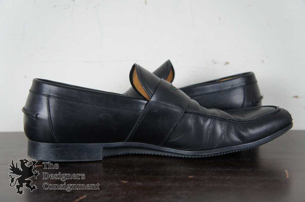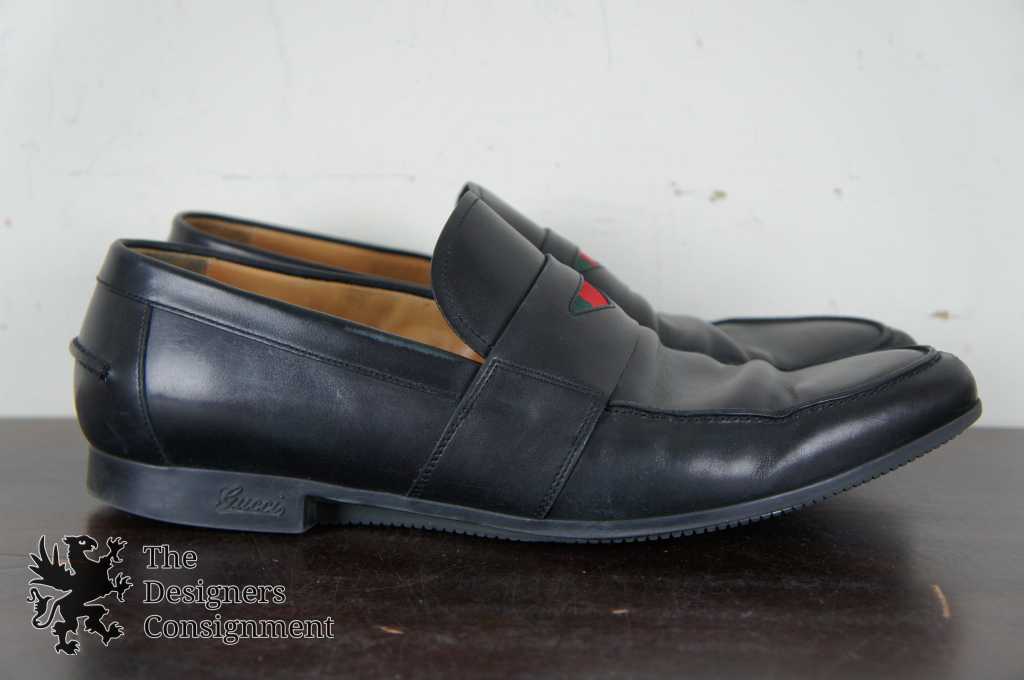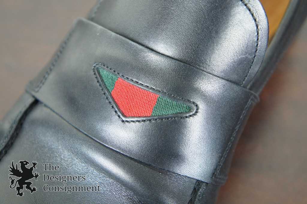 Features penny loafer style with classic Gucci red/green