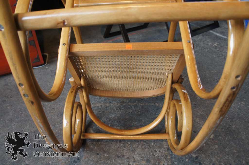 Thonet style attributed rocking chair. Circa mid century. Made from birch in the classic bentwood styling with rattan back and seat.