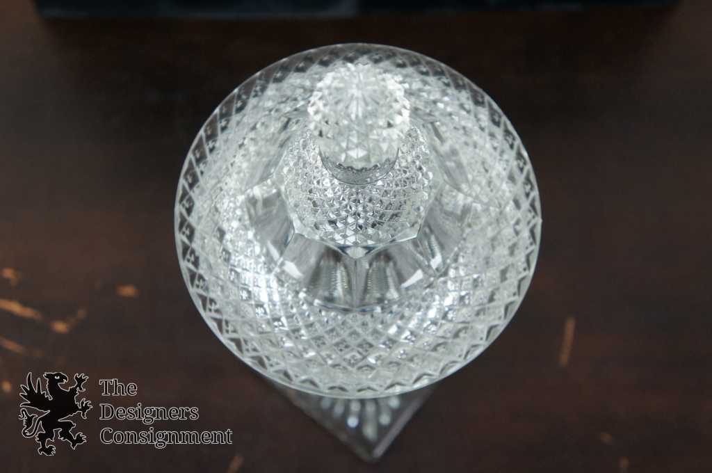 Features pressed glass, a footed base and fancy lid with finial