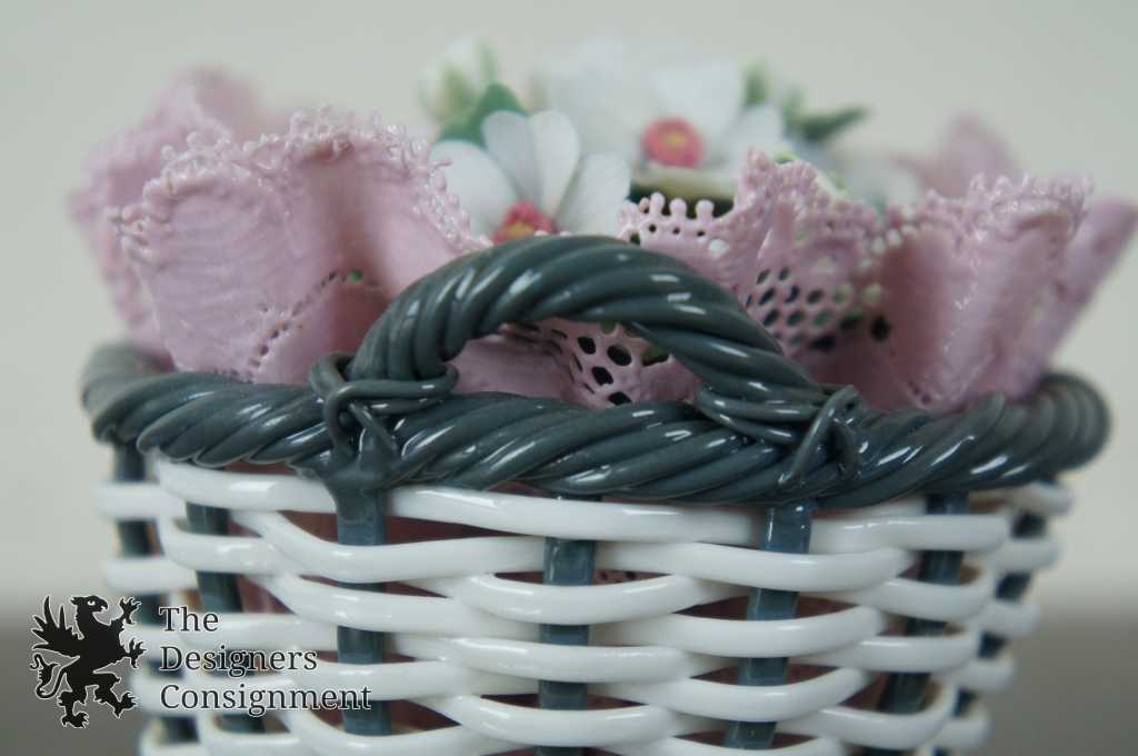 Lladro Small Grey Flower Basket 1554.3. Issued only from 1987 to 1991. Decorated with white petunias and a capricho pink lace finish.