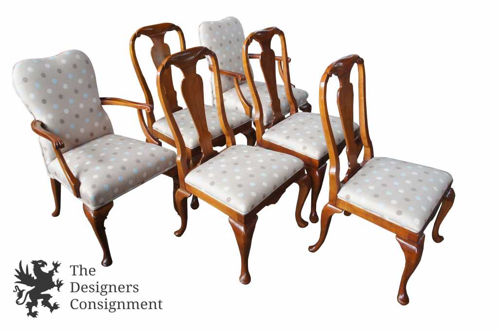 An exquisite set of 6 Baker chairs. 4 sides and 2 arms with upholstered backs. Made from a distressed american walnut with urn shaped splats and cabriole legs. The chairs are upholstered in a floral design. Circa 1970-80s