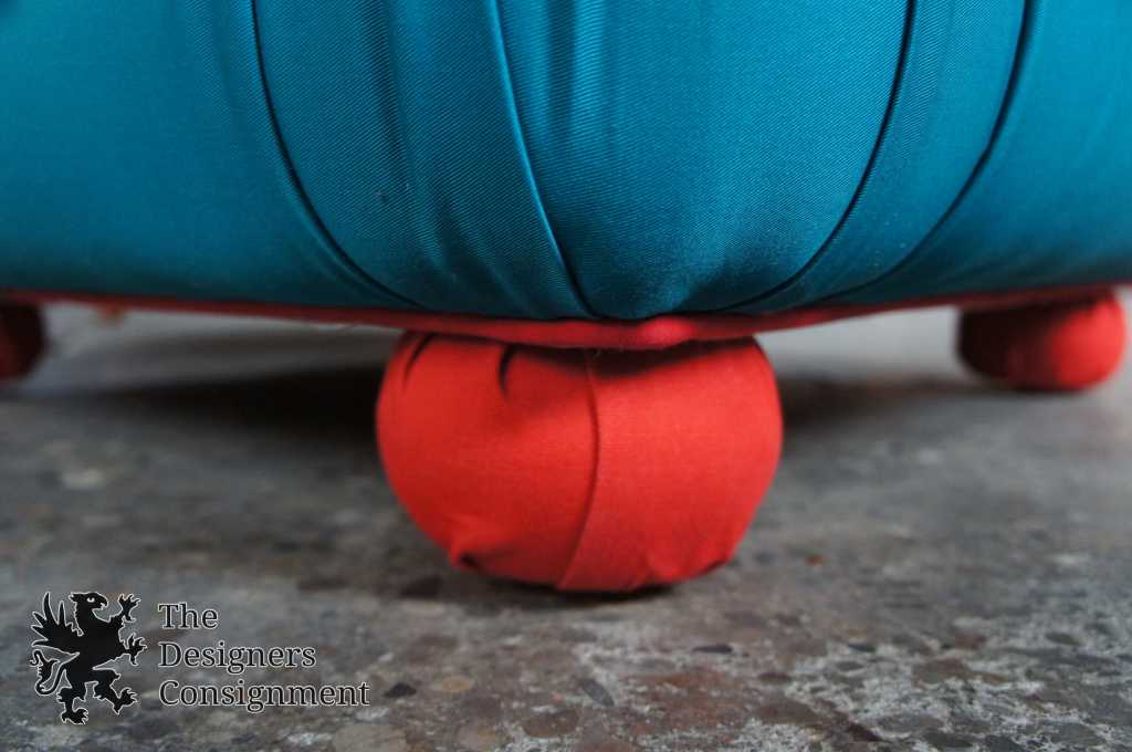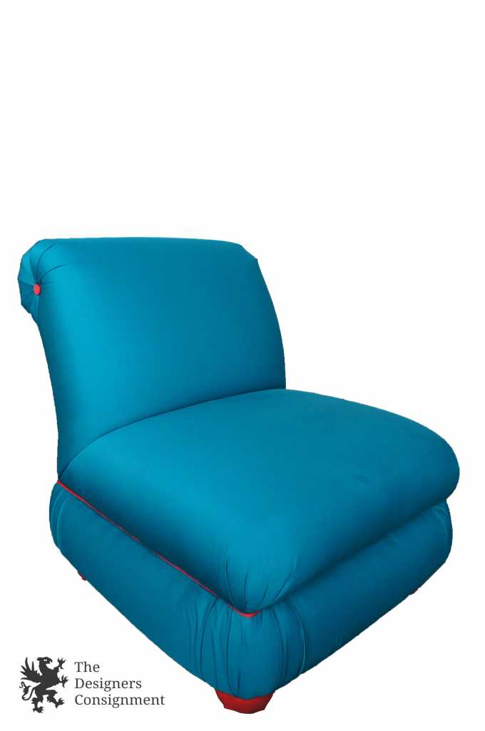 Post modern, contemporary slipper chair. A large chair upholstered in turquoise with red trim. A statement for any room.