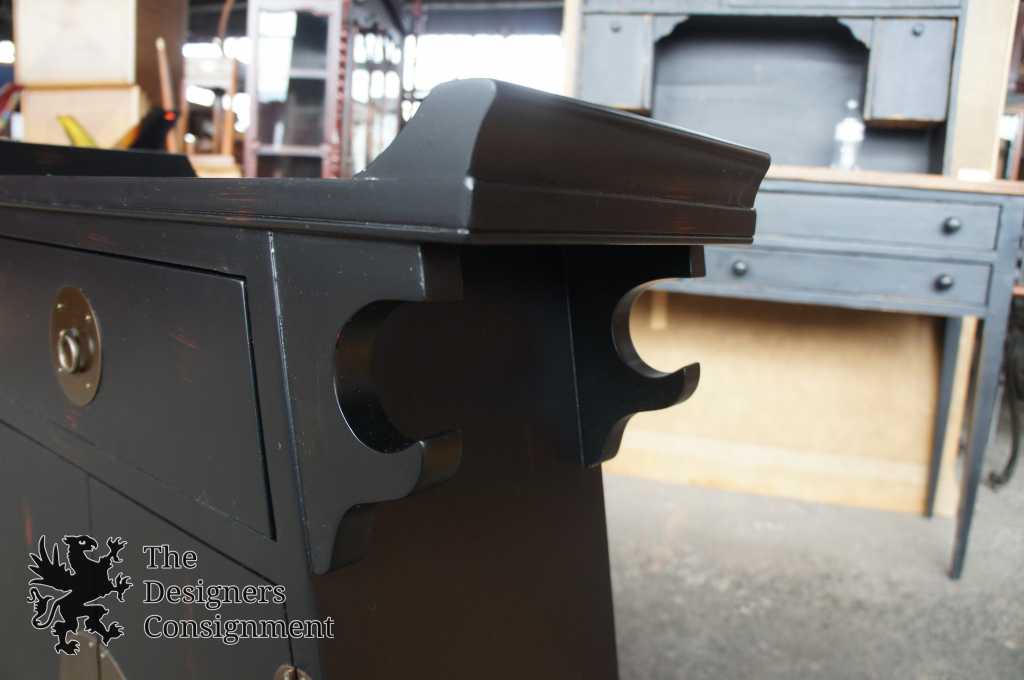 Chinese Ming style altar table. Black lacquered with a tapered body, brass hardware and scrolled accents. Includes lower cabinet with shelf and upper drawer. A neat addition to any setting.