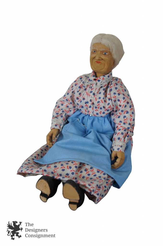 A hand carved foll from 1975 featuring an old woman with gray hair. Her lips and eyes are hand painted. She is wearing an apron over her dress. Bottom of shoe signed 1975. Maker unknown