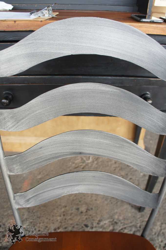 A beautiful ladderback chair made from wrought iron with a pewter finish and maple seat.