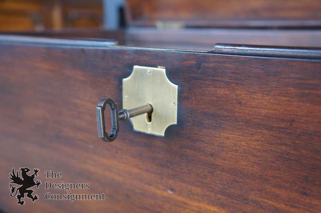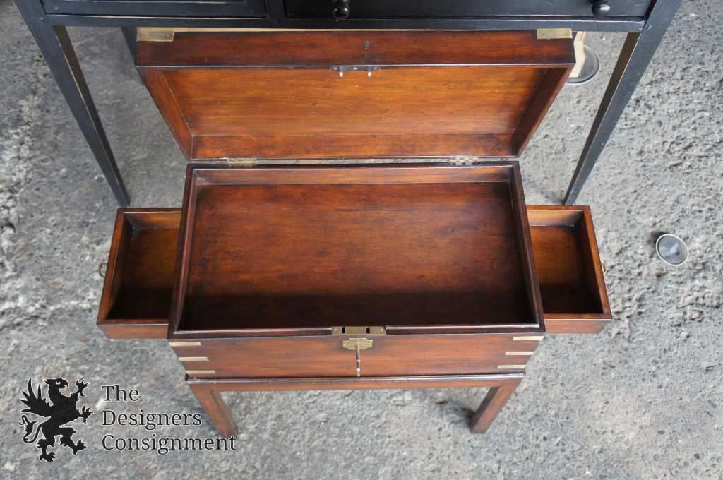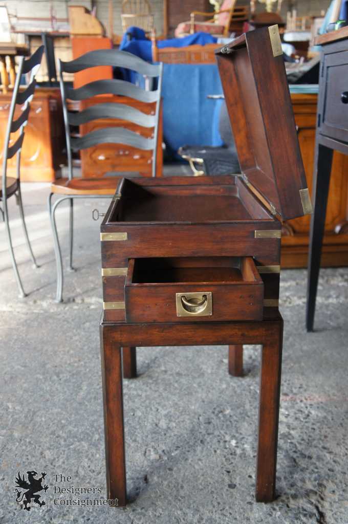 Sarreid Ltd Campaign Style Chest On Stand. Finished in Mahogany with brass banding. Includes 2 drawers with false space below and upper lockable compartment. Sarreid is based out of North Carolina and has been sourcing exceptionally crafted reproductions for over 50 years. This beautifully kept piece was purchased in the late 90s. Perfect for use as an end table or stand alone piece.
