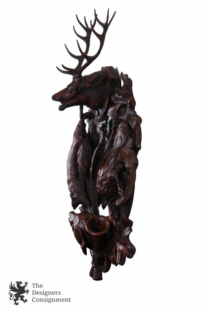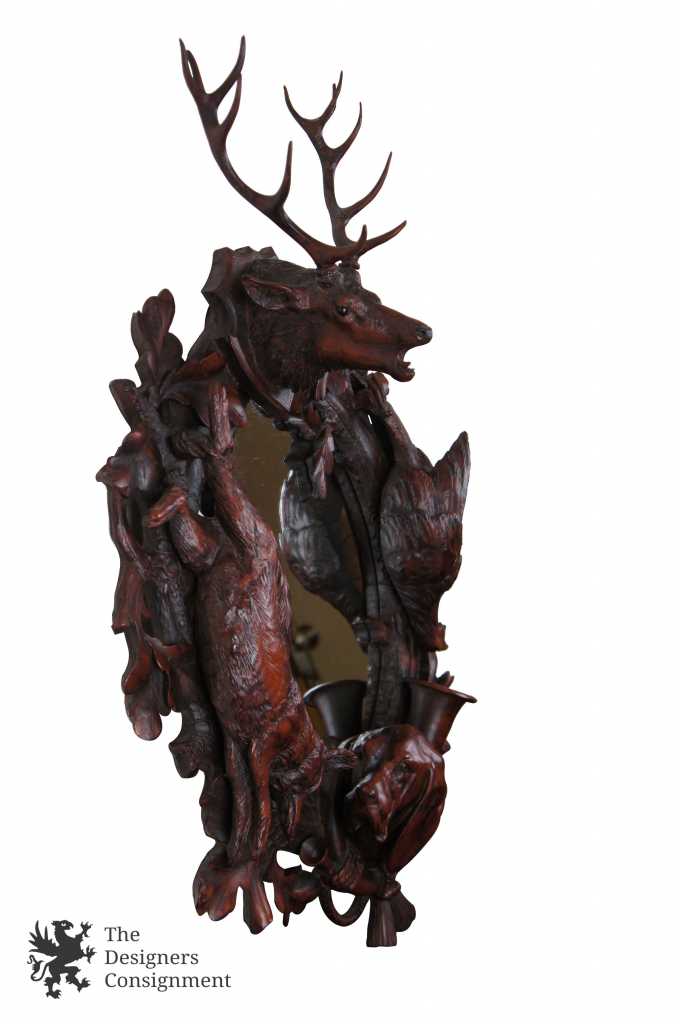This high quality reproduction of a mid 19th century black forest mirror, features a Hound Dog, Elk, Fox and Grouse. Made of resin. Mirror can be removes and replaced with artwork. A neat addition to any collection.